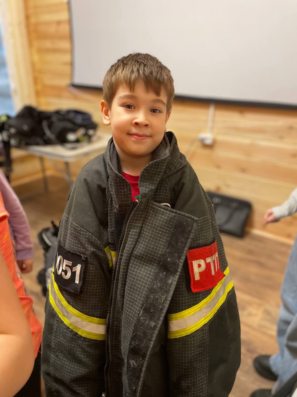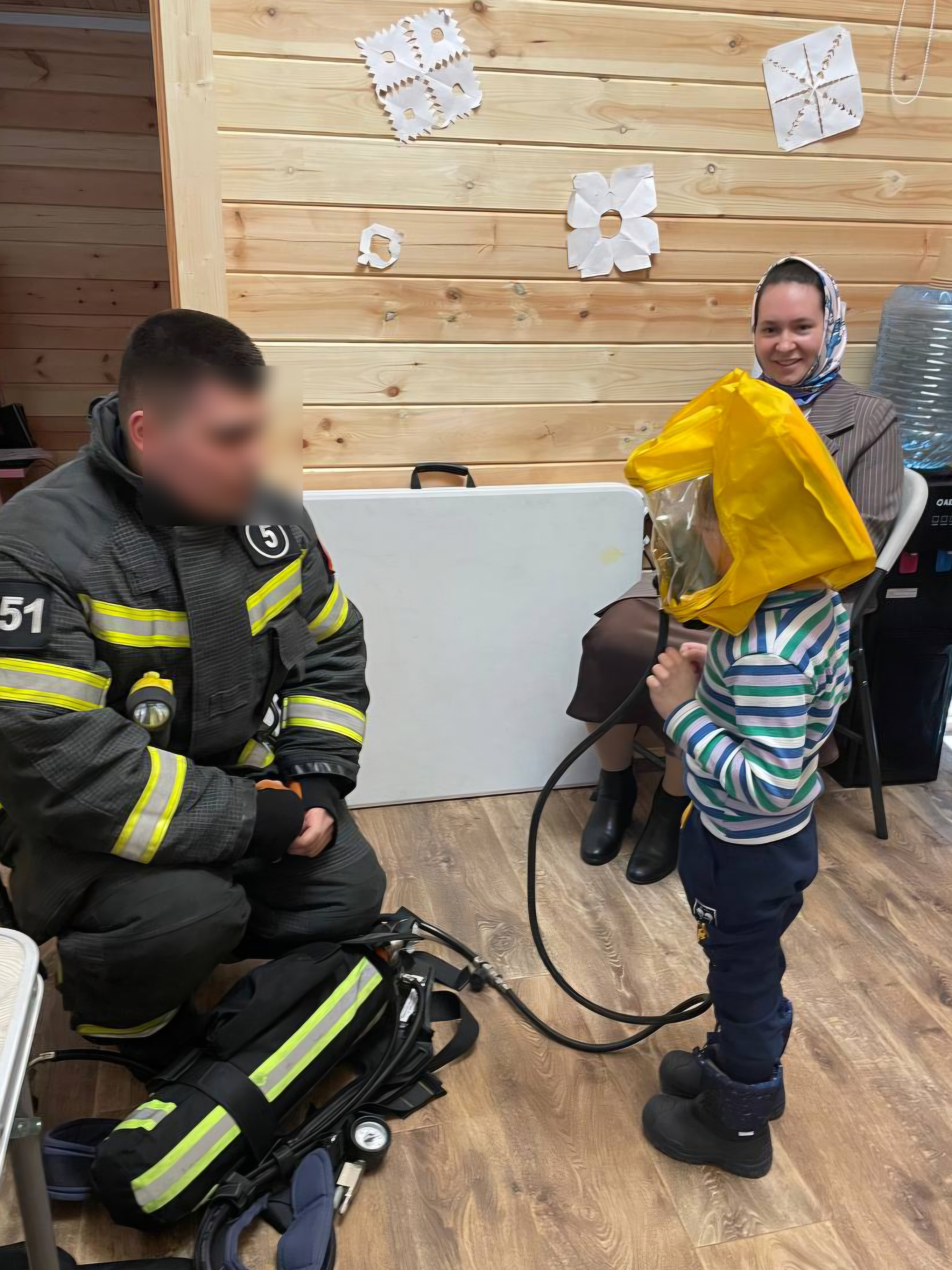 Ребята были активны, задавали вопросы. Им разрешили примерить на себя куртку и защитный шлем пожарного и сделать фото.